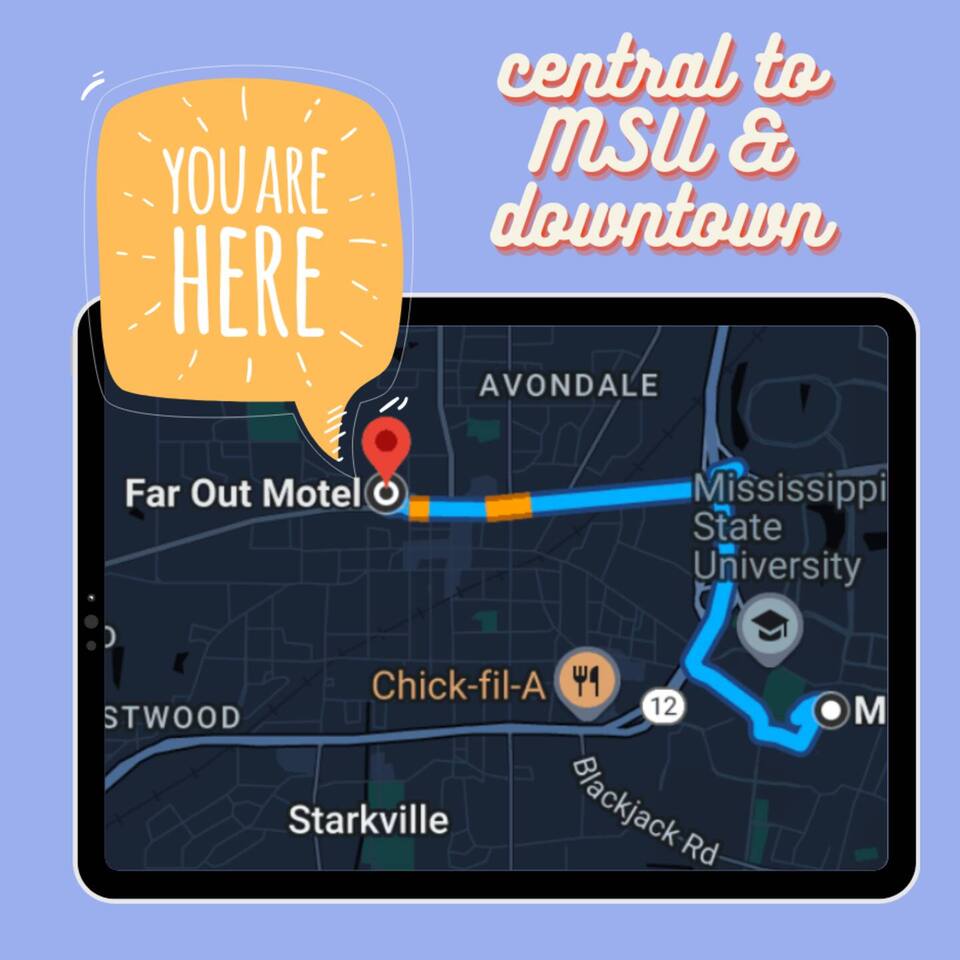 Welcome to the Far Out Motel, just a stone's throw from MSU! Step into a blast from the past with our retro-inspired rooms, revamped with a modern twist for your ultimate comfort. Enjoy our stylish outdoor patio and lounge area, perfect for unwinding or socializing after a day of exploring. Located conveniently downtown, you'll have the best of Starkville’s dining and nightlife right at your doorstep. Experience the perfect blend of nostalgic charm and contemporary convenience.